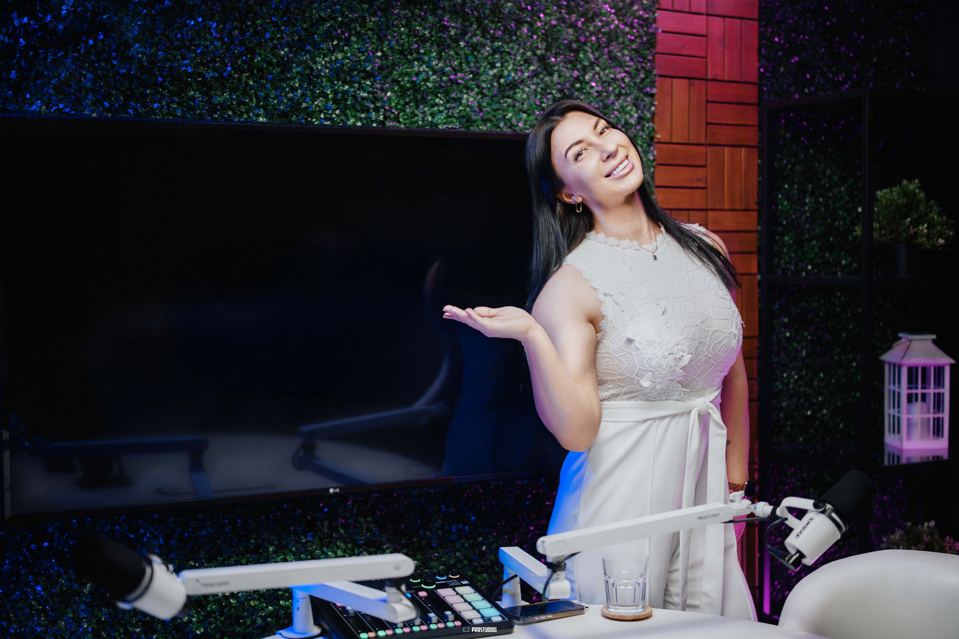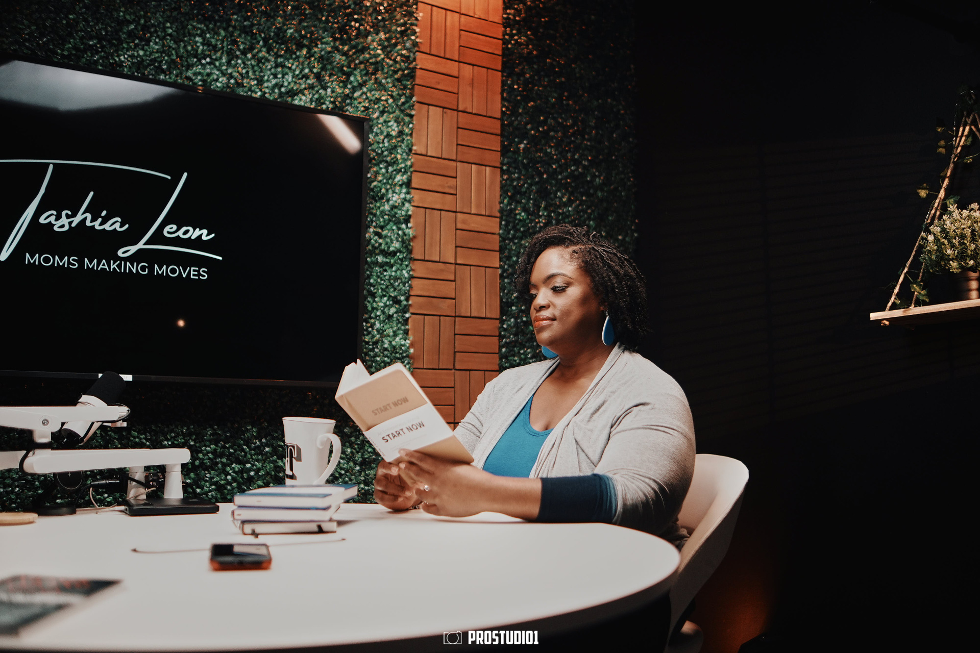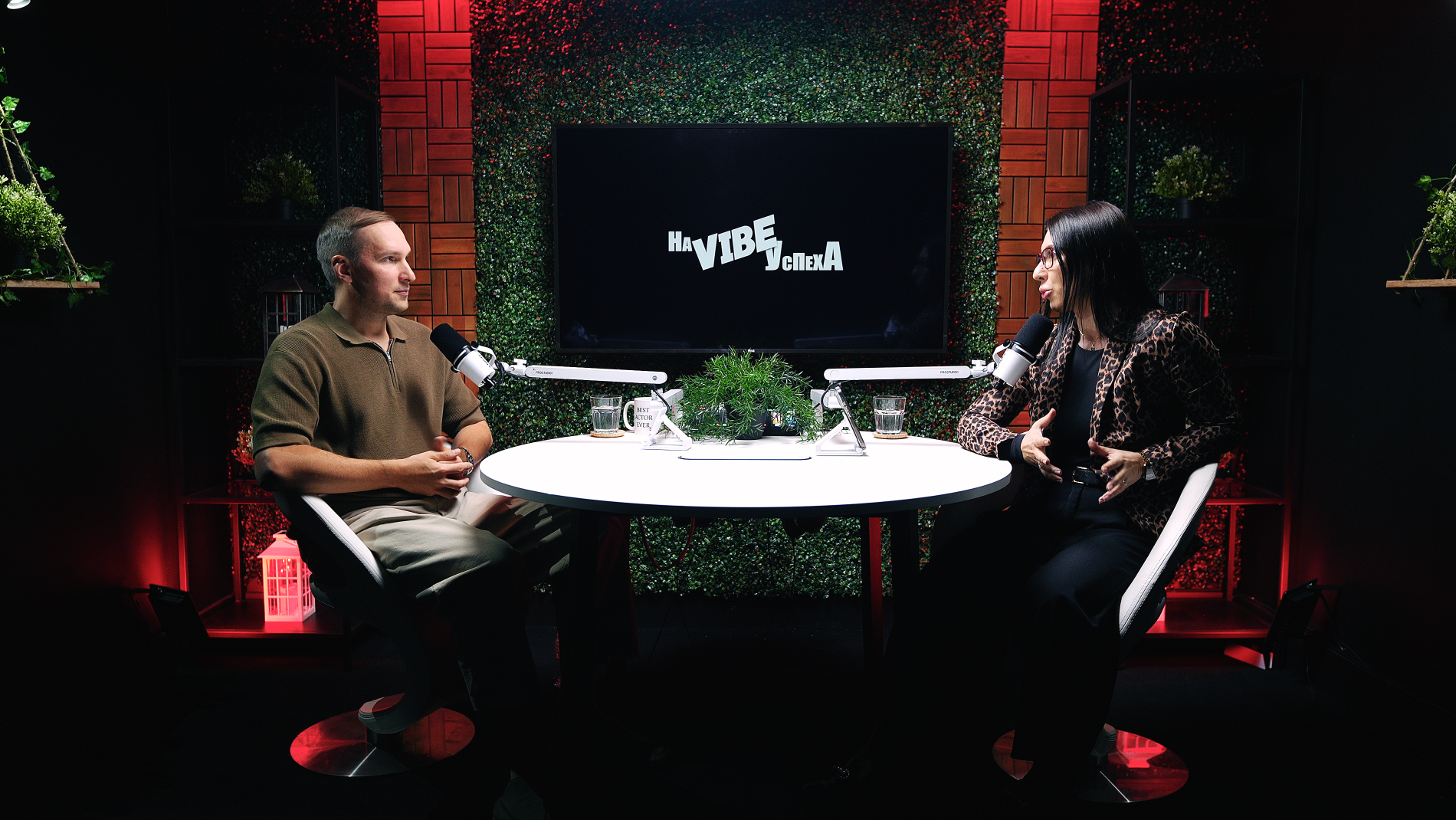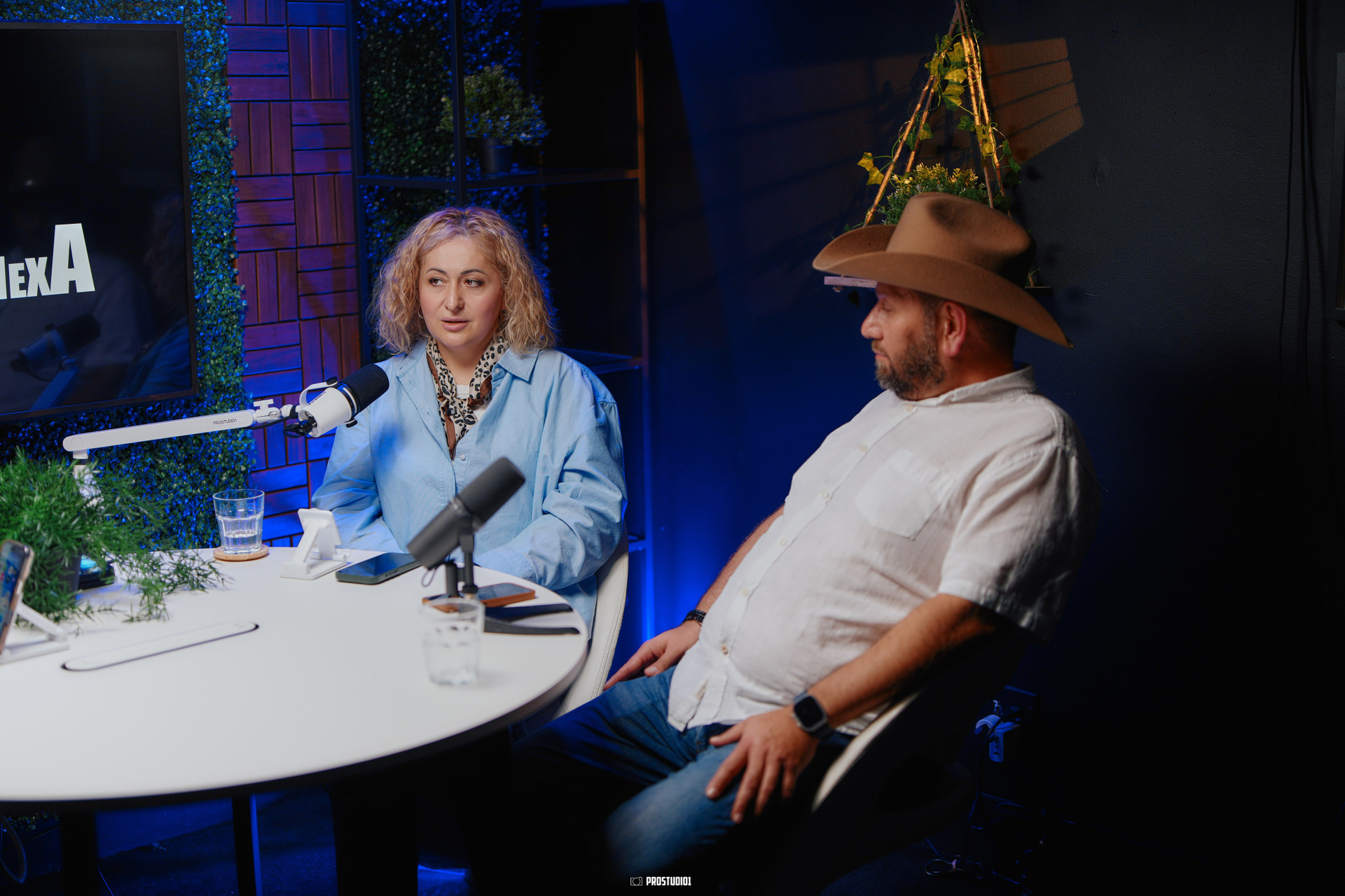 This zone features a professional talk-show style set with two modern armchairs arranged around a small table, creating an inviting stage for interviews or panel discussions. The backdrop includes a stylish green foliage wall and a customizable screen (where your logo or city skyline can be displayed), giving the space an authentic late-night TV feel. Soft studio lighting and chic décor (potted plants, clapboards, etc.) set a polished yet cozy atmosphere, making guests feel at ease. The layout can comfortably accommodate two to three people on camera, perfect for a host and one or two guests in conversation. The acoustically treated walls and quality microphones ensure clear sound, so your voices stand out without echo or background noise.