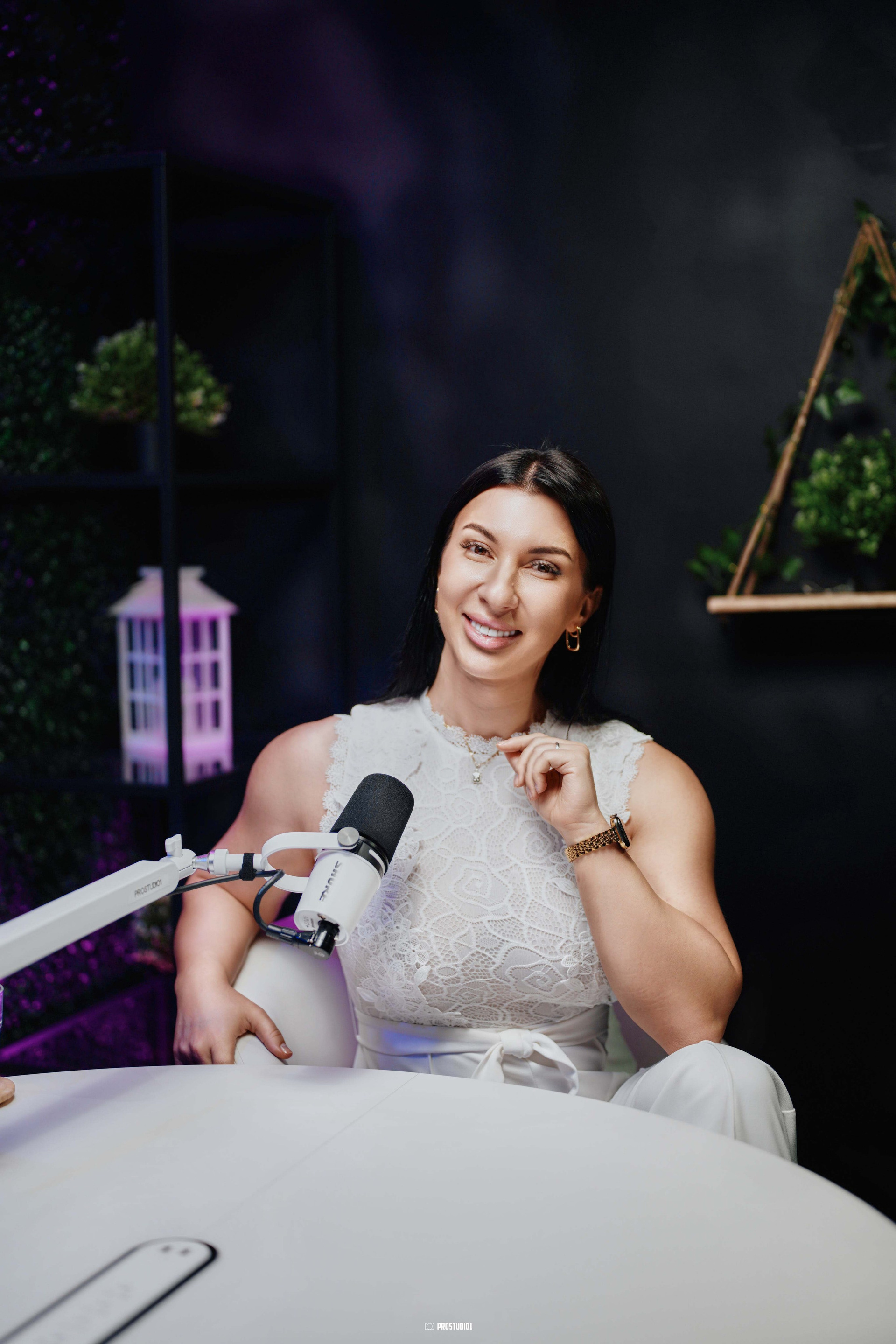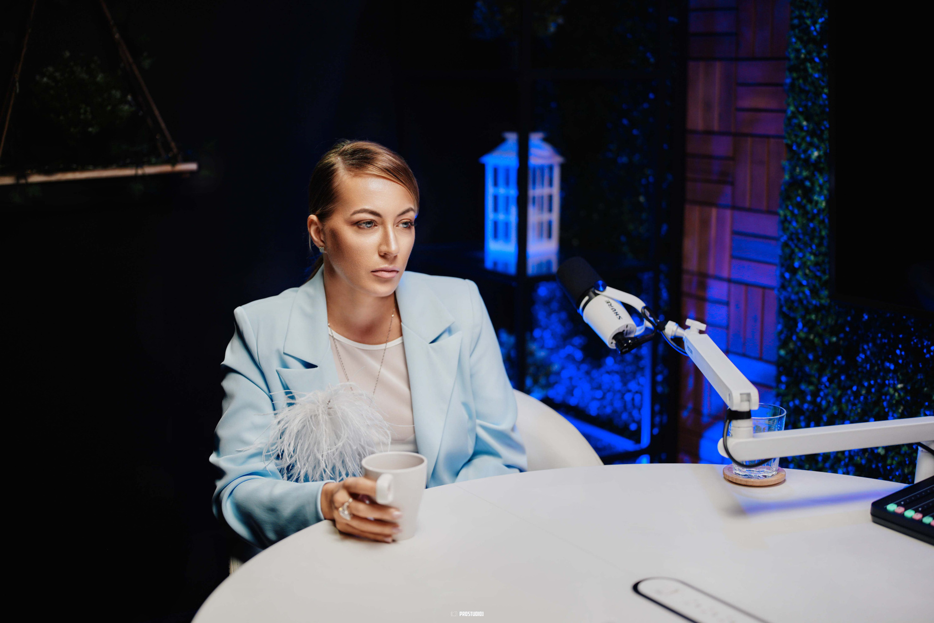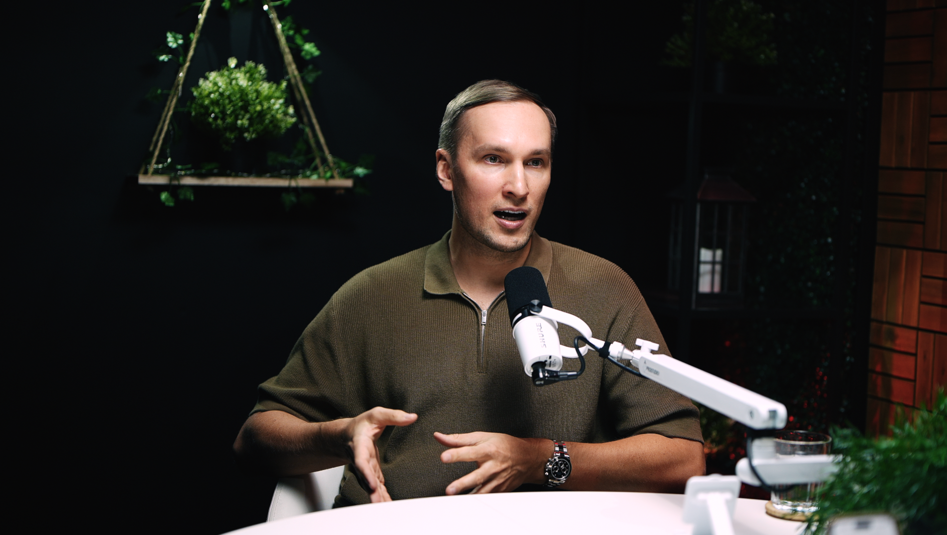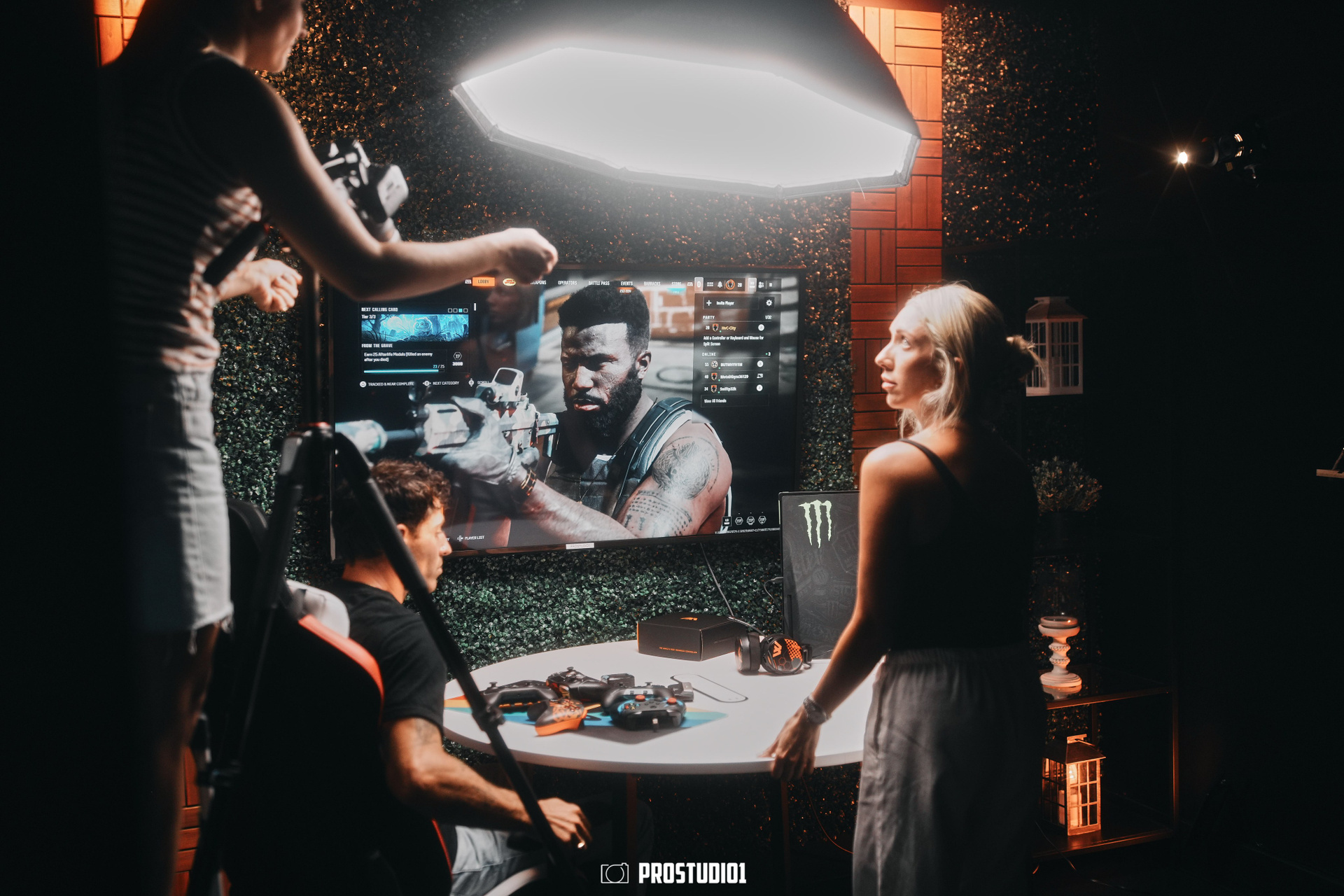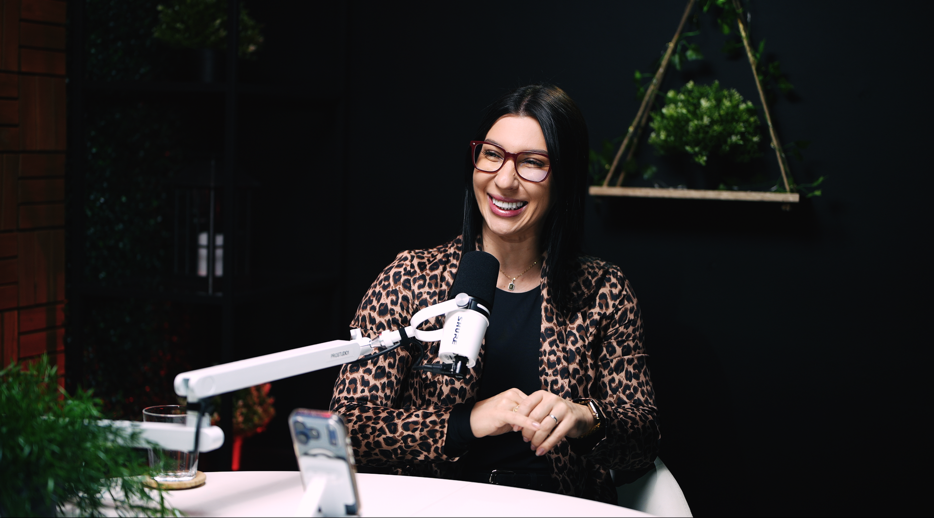 This zone features a professional talk-show style set with two modern armchairs arranged around a small table, creating an inviting stage for interviews or panel discussions. The backdrop includes a stylish green foliage wall and a customizable screen (where your logo or city skyline can be displayed), giving the space an authentic late-night TV feel. Soft studio lighting and chic décor (potted plants, clapboards, etc.) set a polished yet cozy atmosphere, making guests feel at ease. The layout can comfortably accommodate two to three people on camera, perfect for a host and one or two guests in conversation. The acoustically treated walls and quality microphones ensure clear sound, so your voices stand out without echo or background noise.