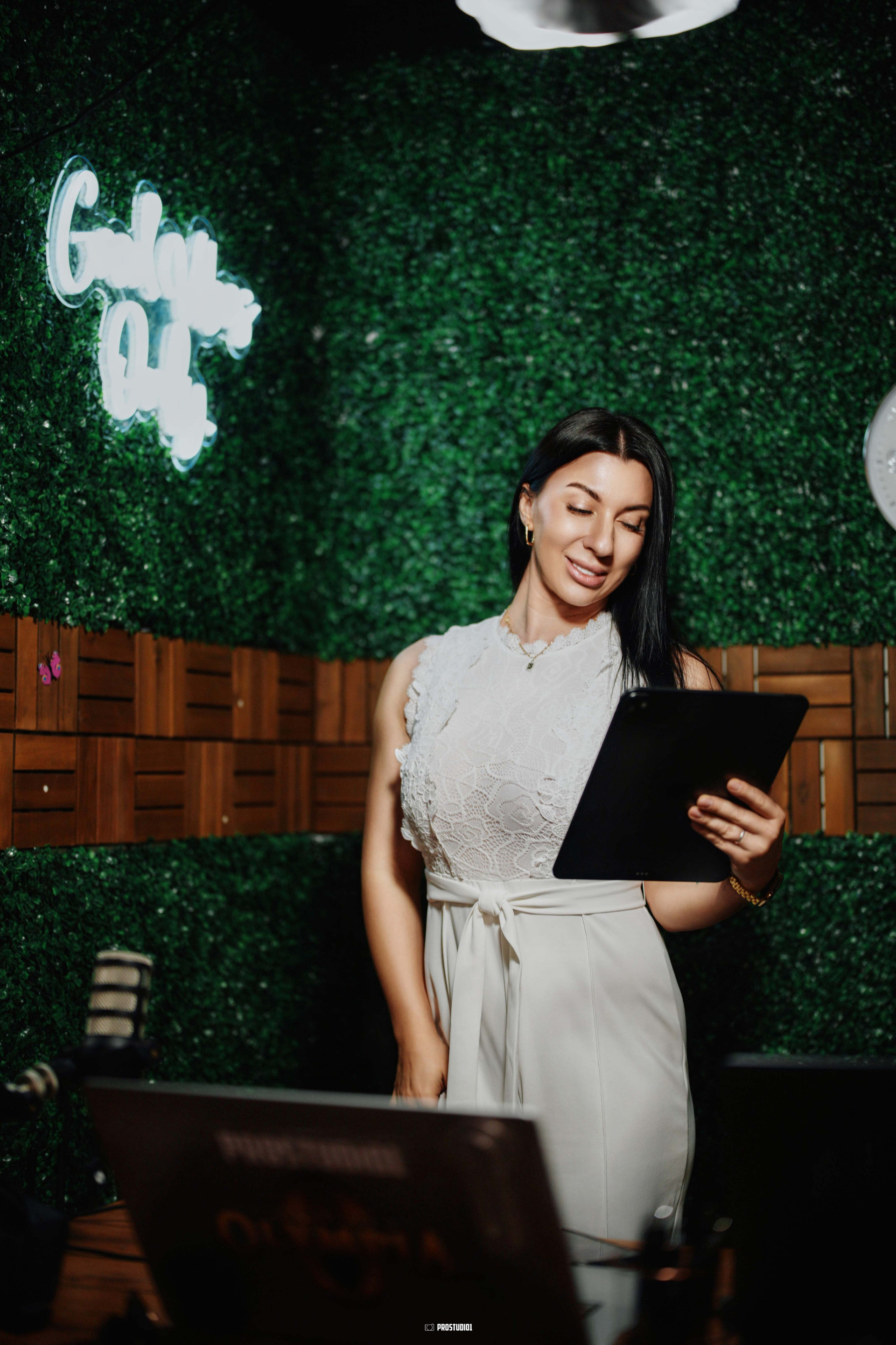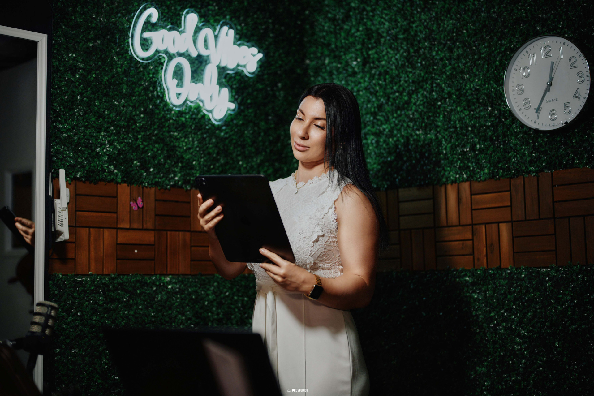 Zone #4, nicknamed “Good Vibes, ” lives up to its name with a comfortable and creatively styled setup. Imagine a scene with cozy armchairs against a backdrop of warm-toned wood panels and maybe a funky neon sign glowing with a phrase like “Good Vibes Only” — this zone radiates a welcoming, youthful energy. (If a neon “LIVE ON AIR” sign or other LED accents are visible in the photos, mention them as cool focal points that enhance the atmosphere.) The decor might include quirky touches — perhaps shelves with books or a retro microphone prop — giving the space personality without overwhelming your own branding. The lighting here is soft and flattering, great for casual podcasts, lifestyle vlogs, or panel discussions where you want the tone to be upbeat and informal.